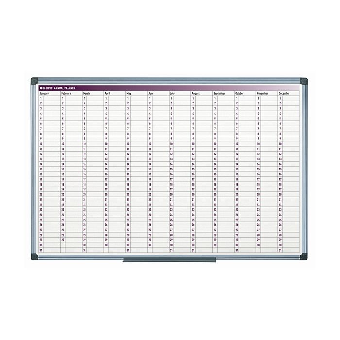 Magnetic 365-Day Annual PlannerPerfect for those with a hectic schedule, the Magnetic 365-Day Annual Planner helps you organise projects days, weeks and months in advance. Busy? It’s time to keep success to schedule!Make the most of every day with this full year planner.Magnetic drywipe surface is perfect when plans get changed.Light-weight and cost-effective option to steel-based year planners.Stylish anodised aluminium frame with concealed corner fixings.Complete with black dry wipe marker, pen tray, 2 round 15mm magnets and wall fixing setDate all year long with 12 magnetic strips (supplied).2 Year surface warranty.Size 900 x 600mmFREE DELIVERY to Mainland UK.