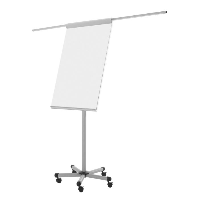 It has the following features, height adjustable without screws, high quality magnetic dry erase surface, two extendable side arms included, adjustable pad clamp for both Euro and A1 pads, stable steel construction and has 5 locking castors