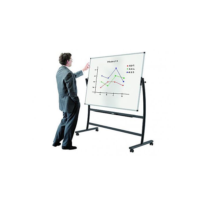 High-quality designer mobile whiteboard with ‘FREE ROTATION’ safety turning system allowing writing on both sides of the board.The new ergonomic design provides the most comfortable position for the user. Incorporates a tray for pens and accessories. Sturdy metal stand with easy-glide lockable castors for easy movement.1500 x 1200mm lacquered steel double-sided magnetic whiteboard.Easy to assemble. Weight - 34kg
