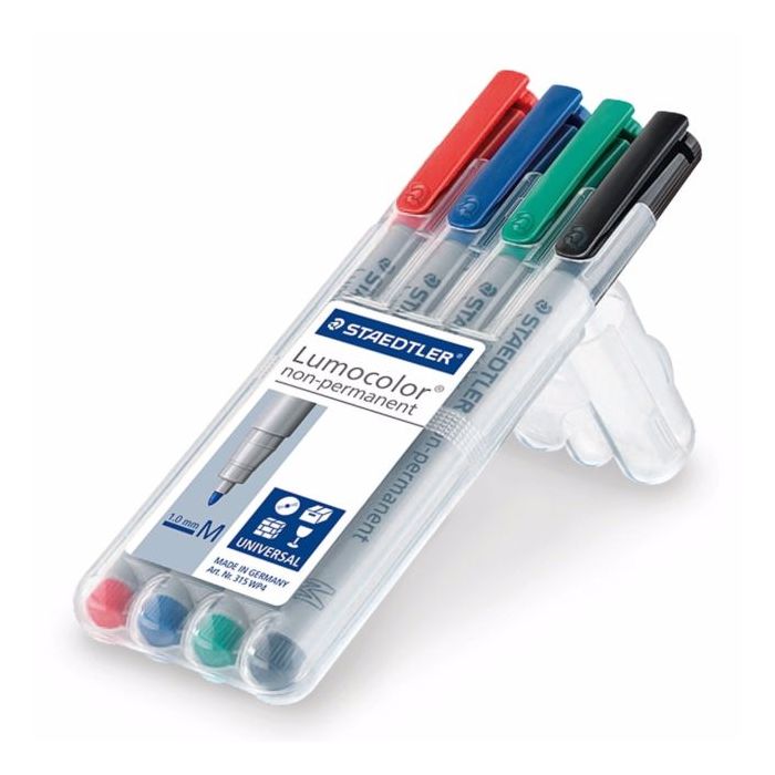 - STAEDTLER Lumocolor non-permanent universal pens are perfect for being used on the following surfaces: Paper, cardboard, film, plastic, metal, polystyrene, glass, porcelaine, wood, leather and stone.